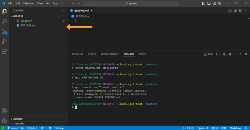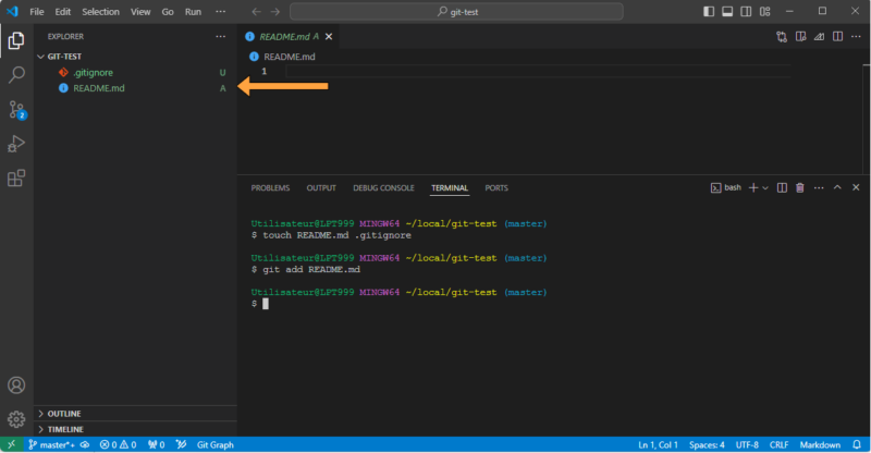 Dans VS Code, nous voyons qu'un « A » (pour « ajouté ») a remplacé le « U » à droite du fichier « README.md » (comme dans la version courte de git status). Notons aussi que Git nous indique qu'il y a un fichier non suivi (« Untracked file ») qui correspond au « .gitignore » que nous n'avons pas ajouté encore à l'espace de staging.