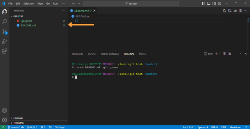 Commençons par créer deux fichiers que nous retrouvons très souvent dans des dépôts Git : « README.md » et « .gitignore ». Nous reviendrons plus loin sur le rôle de ces deux fichiers.