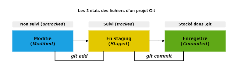 - En staging (Staged) : un ou plusieurs fichier(s) du répertoire de travail ont été ajoutés (staged) avec la commande git add et sont maintenant suivis (tracked) par Git. Dans cet état, ces fichiers sont prêts à être enregistrés (commited ou « commités » ) dans Git.