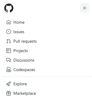 Si vous appuyez sur le menu latéral (« hamburger »), vous verrez les principales options de navigation disponibles pour l'utilisation de GitHub.