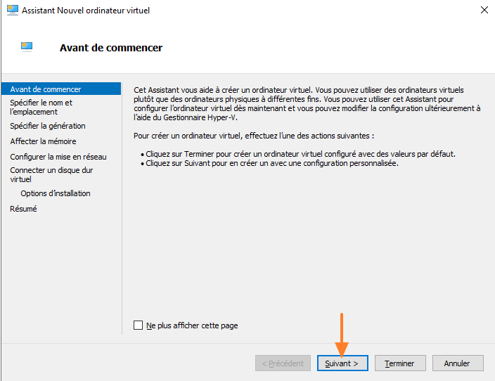 Nous allons commencer par créer un nouvel ordinateur à partir du "Gestionnaire Hyper-V". Cliquez sur "Nouveau" dans le menu de droite puis sur "Ordinateur virtuel". Passez la première étape.