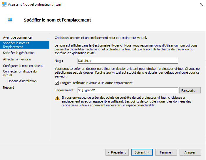 Spécifiez le nom de la VM, par exemple "Kali Linux". Si vous ne définissez pas d'emplacement, la VM sera créée à l'emplacement par défaut défini dans les paramètres d'Hyper-V. Cochez l'option "Stocker l'ordinateur virtuel à un autre emplacement" pour qu'elle soit stockée dans le répertoire "V:\Hyper-V\Kali Linux". Ainsi, nous suivons la même logique que pour les précédentes VMs.