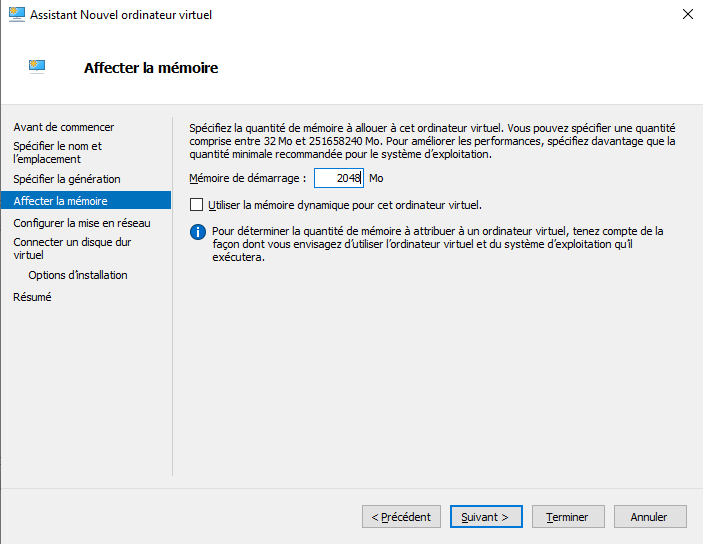 Vous pouvez indiquer 2 Go de RAM pour cette machine virtuelle. Libre à vous d'attribuer plus de RAM à la VM, dès maintenant ou par la suite.