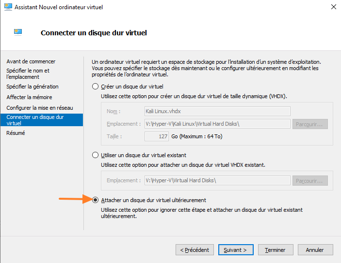 Nous n'allons pas créer un nouveau disque dur virtuel, car nous avons déjà un fichier VHDX avec Kali Linux préinstallé. Choisissez "Attacher un disque dur virtuel ultérieurement" et poursuivez.