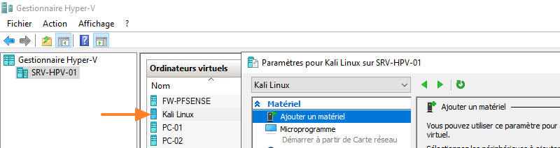 La machine virtuelle "Kali Linux" est bien visible sur l'hôte Hyper-V. Accédez à ses paramètres via un clic droit sur son nom.