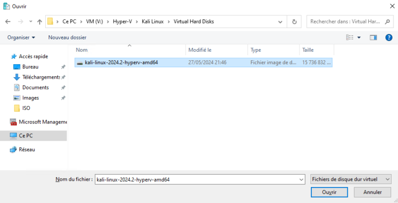 Vous devez spécifier le chemin vers le fichier "kali-linux-2024.2-hyperv-amd64.vhdx" présent dans l'archive 7-Zip. Je vous recommande de créer le répertoire "Virtual Hard Disks" dans le dossier la VM (voir image ci-dessous), et de couper-coller le disque virtuel à l'intérieur. Ensuite, sélectionnez le fichier.