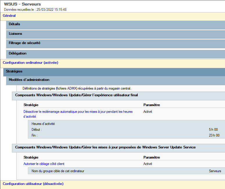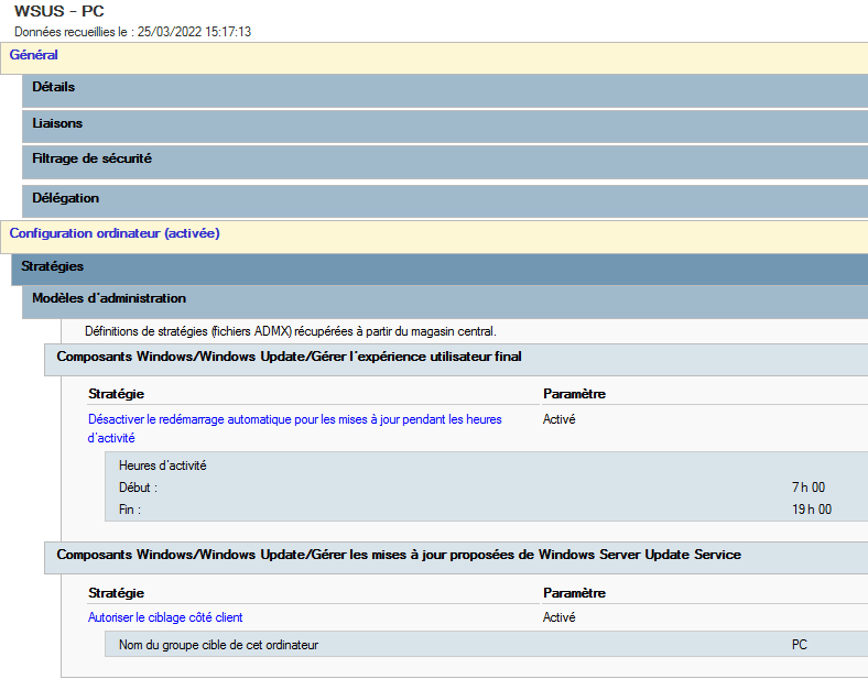 Note : si vous souhaitez utiliser WSUS uniquement sur certaines machines, appliquez un filtrage de sécurité sur un groupe de sécurité spécifique ou liez la GPO uniquement sur certaines OUs.