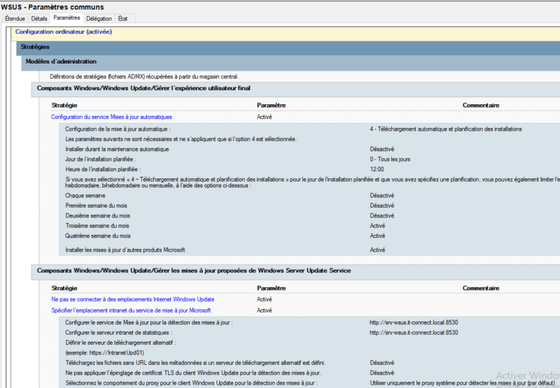 Nous verrons qu’il y a un paramètre pour spécifier l’emplacement du serveur WSUS, donc ce sera commun à toutes les machines, que ce soit des postes de travail ou des serveurs.