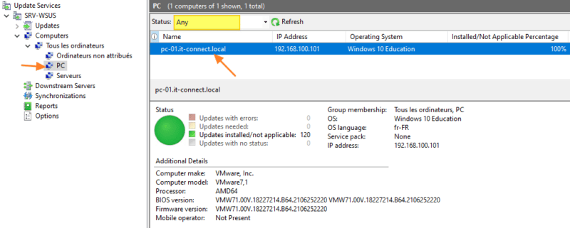 L’ordinateur « PC-01.it-connect.local » est bien visible ! Il est désormais lié au serveur WSUS !