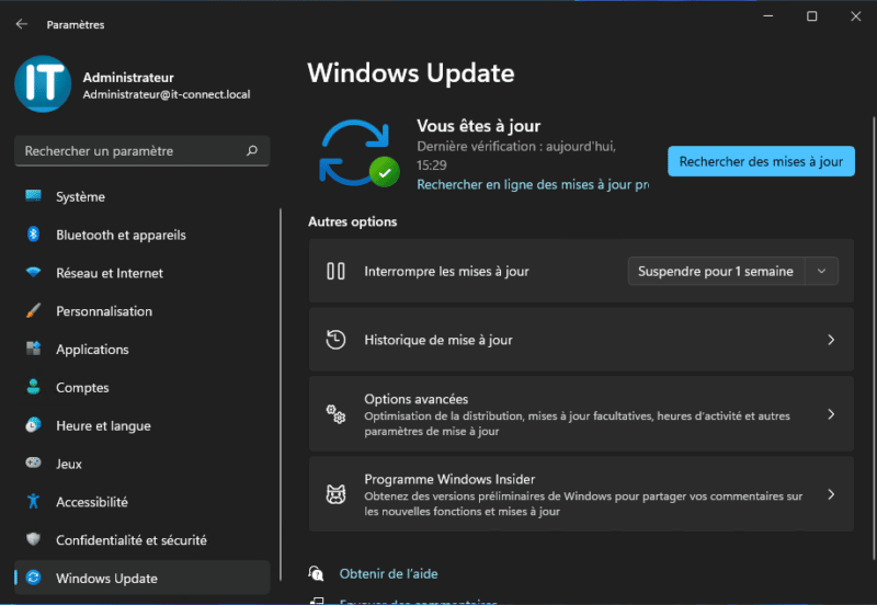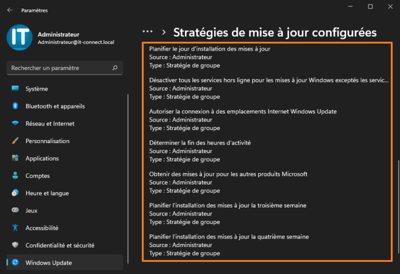 D’ailleurs, on peut s’assurer que la stratégie est bien appliquée via l’outil « gpresult », mais aussi, sous Windows 11, en cliquant sur « Options avancées » (toujours dans Windows Update) puis « Stratégies de mises à jour configurées ».