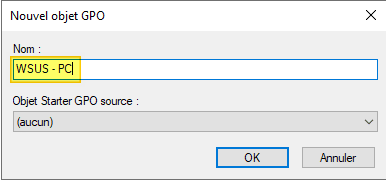 Créez une nouvelle stratégie de groupe nommée « WSUS – PC » et liez cette GPO à l’unité d’organisation qui contient vos postes de travail. Au sein de mon annuaire, il s’agit de l’OU « PC ».