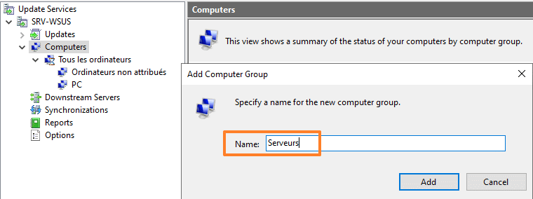 Avant d’entamer la création de nos stratégies de groupe, nous allons créer nos deux groupes sur le serveur WSUS : « PC » et « Serveurs ». En production, vous pouvez créer également un groupe nommé « Tests » pour tester les mises à jour avant le déploiement à grande échelle.