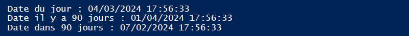 Write-Output "Date du jour : $(Get-Date)" Write-Output "Date il y a 90 jours : $((Get-Date).AddDays(-90))" Write-Output "Date dans 90 jours : $((Get-Date).AddDays(90))"