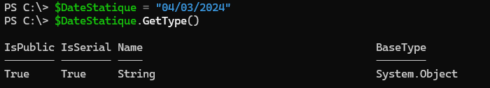 Pour récupérer de façon statique une date et la stocker dans une variable pour hériter du bon type ("DateTime"), nous pouvons directement exploiter les paramètres de la commande "Get-Date", comme ceci :