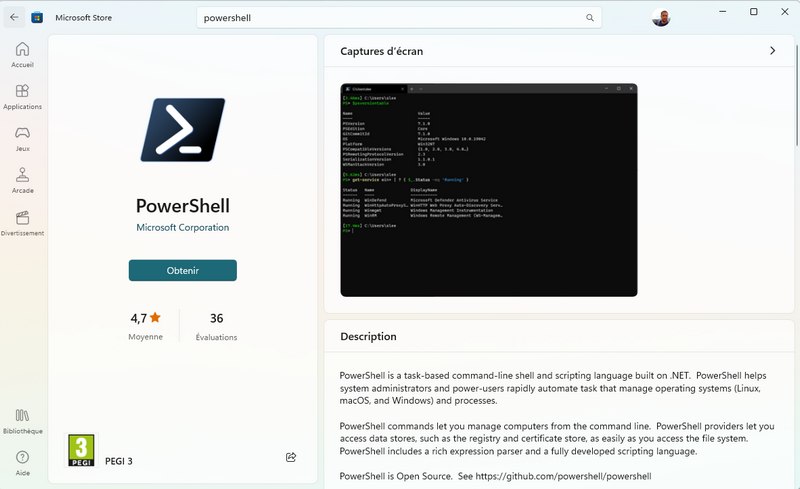 Ceci est possible car WinGet s'appuie sur le catalogue Microsoft Store et PowerShell est bien distribué via le magasin d'applications de Microsoft.