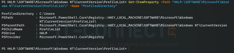 Pour récupérer la valeur d'une valeur du registre, nous allons devoir utiliser le cmdlet "Get-ItemProperty" suivi du chemin vers la clé et le nom de la valeur situé dans cette clé. Voici un exemple avec la valeur "ProfilesDirectory" situé dans la branche "HKLM:\SOFTWARE\Microsoft\Windows NT\CurrentVersion\ProfileList\".