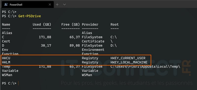 Sur une machine Windows, si vous avez la curiosité de consulter la liste de vos lecteurs avec le cmdlet "Get-PSDrive", vous pourrez remarquer qu'il y a deux lecteurs avec le fournisseur (Provider) "Registry". Ceci correspond au Registre Windows. Nous avons d'une part "HKCU" pour la ruche "HKEY_CURRENT_USER" et "HKLM" pour la ruche "HKEY_LOCAL_MACHINE".