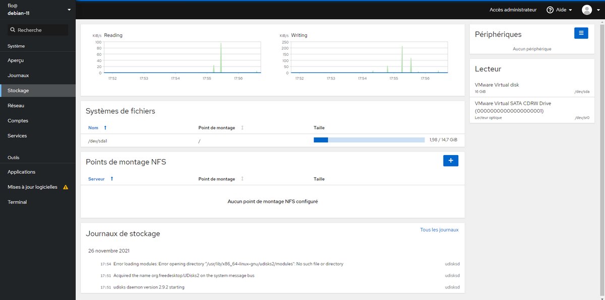 La section "Stockage" permet de visualiser des graphiques de performances (lecture et écriture), de visualiser les volumes, les points de montage NFS et les journaux liés au stockage. Sur la droite, on a également une visibilité sur les périphériques physiques (disques physiques, lecteur DVD...).