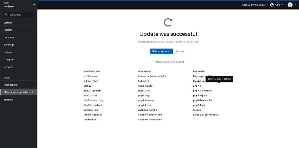 La mise à jour des paquets s'effectue via l'interface Web et la liste des paquets mis à jour s'affiche à l'écran.