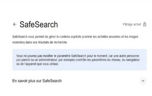 - Si on fait de la recherche depuis un des moteurs de recherches les plus connus et moins « austère » comme celui de Google, par exemple, la fonctionnalité « Safe Search » consistant à filtrer du contenu afin d’y appliquer des restrictions au niveau de la pertinence des résultats (floutage des médias à caractères sexuels ou blocage pur et simple) est automatiquement activée. La levée de ce filtre ne pouvant être faite par personne d’autre en dehors de l’administrateur du poste de travail.