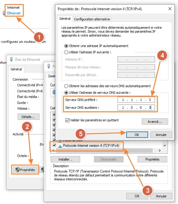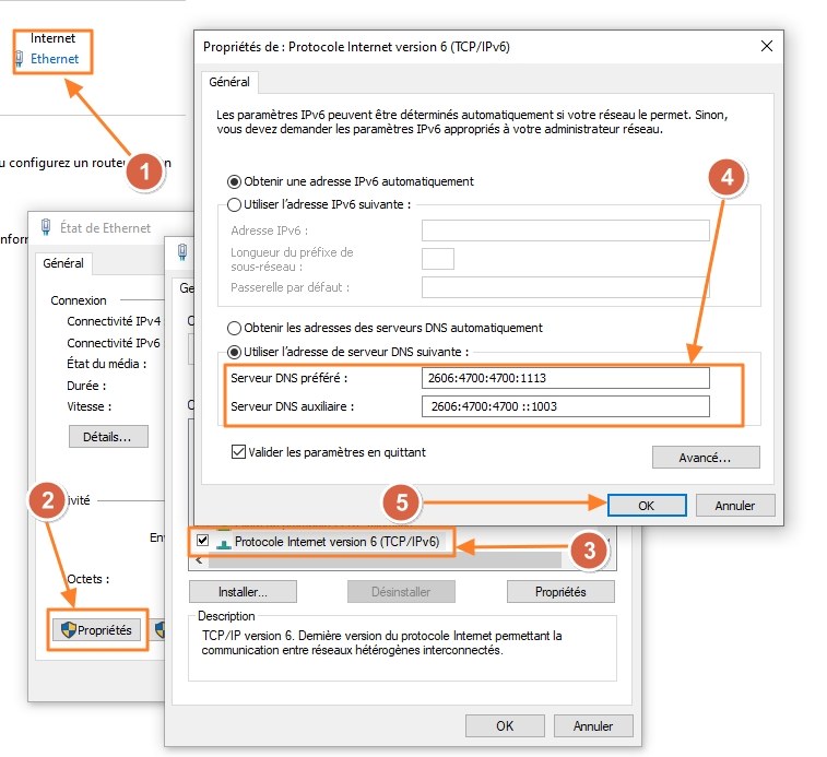 Cette méthode consiste simplement à configurer la ou les carte(s) réseaux à partir desquelles on souhaite avoir accès en indiquant les serveurs DNS de Cloudflare comme DNS primaire et secondaire en IPv4 et IPv6.