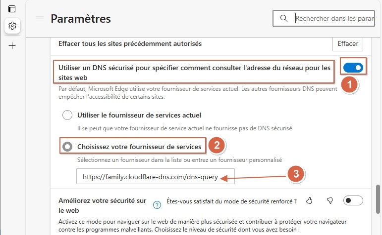 On défile vers le bas et on localise le paramètre « Utiliser un DNS sécurisé pour spécifier comment consulter l'adresse du réseau pour les sites web ». Il est désactivé par défaut. On l’active en déplaçant le point noir vers la droite, on coche l’option « Choisissez votre fournisseur de services » et on insère l’URL suivante dans la case qui apparaît juste en bas : "https://family.cloudflare-dns.com/dns-query" et on redémarre le navigateur.