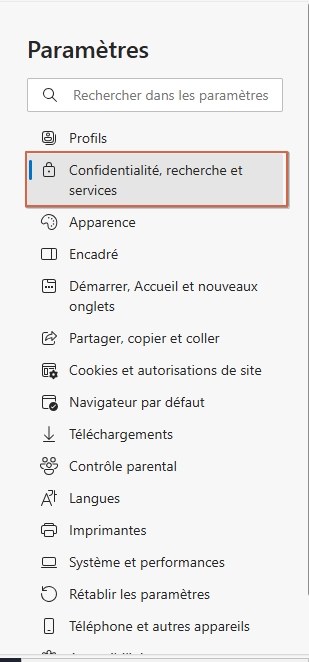 Ensuite, on clique sur l’option « Confidentialité, recherche et services » (en saisissant « edge://settings/privacy » dans la barre d’adresse du navigateur, on parvient au même résultat plus rapidement).