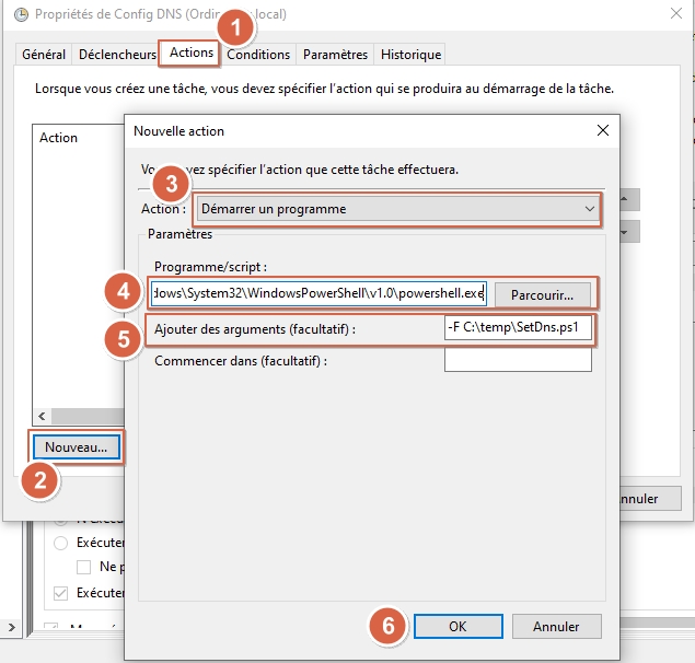 En paramètres, on va chercher l’exécutable de PowerShell (ou on spécifie simplement « 1.1.1.1 ») et en argument, on spécifie « -F » suivi du chemin d’accès au script à exécuter, ici « C:\temp\SetDns1\ » et on valide le tout.