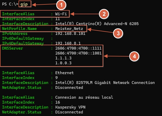 Si tout a été bien configuré, on peut vérifier cela sous une session PowerShell avec les commandes « ipconfig/all » ou « Get-NetIpConfiguration » (ou son alias « gip » comme sur cette capture d’écran). On doit pouvoir retrouver des informations telles que le mode de connexion (filaire, Wi-Fi, etc.), le nom de la carte réseau, le nom du réseau auquel on est connecté, la configuration IP et surtout les serveurs DNS choisis par l’utilisateur.