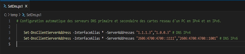 Pour ce faire, on reprend simplement les commandes PowerShell utilisées plus haut et on les place dans un fichier qu’on enregistre ensuite avec l’extension « .ps1 », bien évidemment vous pouvez le nommer comme bon vous semble. Pour ce tutoriel, on l’appellera « SetDns.ps1 ».