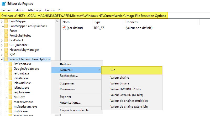 Sous Windows, il existe la clé de Registre "HKEY_LOCAL_MACHINE\SOFTWARE\Microsoft\Windows NT\CurrentVersion\Image File Execution Options" qui sert à définir le programme de débogage pour chaque exécutable présent sur la machine. C'est une fonctionnalité pratique pour les développeurs, mais qui peut être détournée par les pirates informatiques (MITRE ATT&CK) et que, nous aussi, on va pouvoir détourner pour empêcher l'exécution de PsExec.