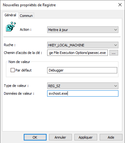 Au sein de cette clé, une nouvelle "Valeur chaîne" nommée "Debugger" doit être créée avec la valeur "svchost.exe" (même si l'on pourrait mettre autre chose). Ce qui donne :