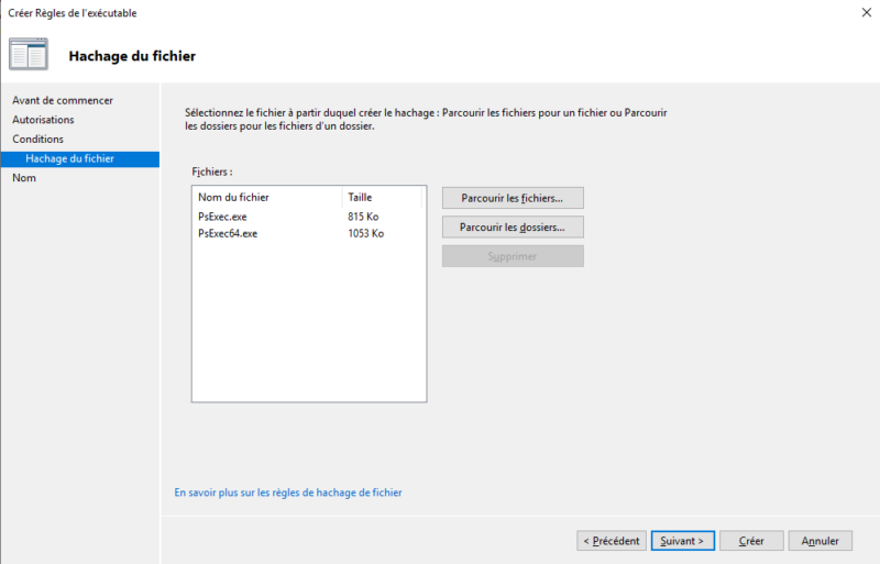 Dans une stratégie AppLocker, nous pouvons ajouter une nouvelle règle basée sur le hachage du fichier pour bloquer l'utilisation de PsExec. Ainsi, on spécifiera les deux exécutables et Windows va calculer le hash tout seul comme un grand.
