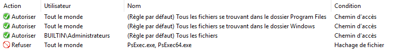 La solution de protection AppLocker, disponible sur les versions Entreprise et Education de Windows, permet de bloquer l'exécution de certaines applications (exécutables ou Modern App), certains scripts, etc... Grâce à ces règles définies par GPO. Il y a quelques mois, j'ai mis en ligne un article complet au sujet de cette fonctionnalité : Tutoriel AppLocker. Pour bloquer un exécutable, on peut s'appuyer sur un chemin d'accès, mais aussi le hash de cet exécutable, ce qui sera intéressant dans le cas de PsExec.