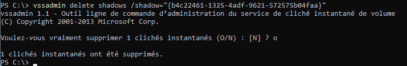 vssadmin delete shadows /shadow="{b4c22461-1325-4adf-9621-572575b04faa}"