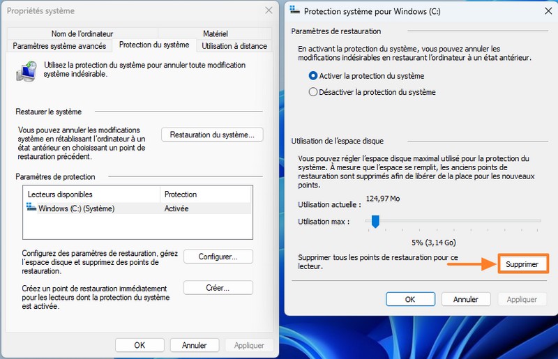 Si vous souhaitez supprimer un ou plusieurs points de restauration de Windows, sachez qu'il y a un bouton "Supprimer" accessible via les paramètres de configuration, dans la section "Protection du système". L'inconvénient, c'est qu'il va supprimer l'ensemble des points de restauration présents sur votre PC, pour le lecteur sélectionné. L'alternative consiste à utiliser l'outil de "Nettoyage de disque" de Windows, mais le résultat sera le même.