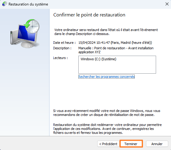 Cliquez sur "Terminer" pour lancer la restauration du système.