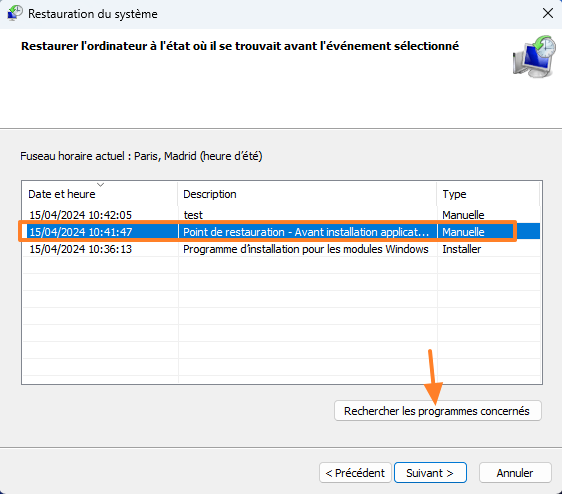 Ici, il vous suffira de sélectionner le point de restauration à restaurer et de lancer l'opération.