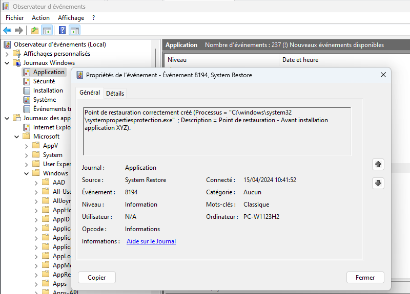 À titre informatif, sachez que cette action crée plusieurs événements visibles dans le journal "Application" de Windows, via l'Observateur d'événements. Ceci permet d'en savoir plus sur le déroulement de l'opération. Lorsqu'un point de restauration est correctement créé, un événement avec l'ID "8194" est ajouté. Voici un exemple :