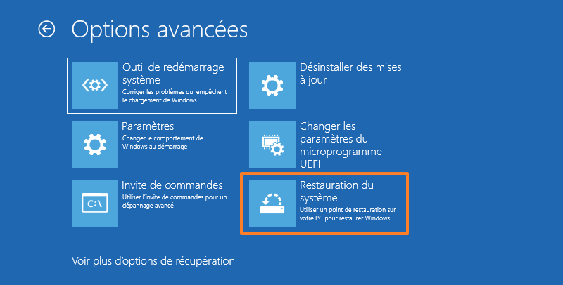 Dans le cas où Windows ne parviendrait plus à s'exécuter correctement, vous pouvez passer par le mode de récupération pour effectuer la restauration du système à un état antérieur. Dans les "Options avancées" de la section "Dépannage", vous pouvez utiliser la fonctionnalité "Restauration du système".