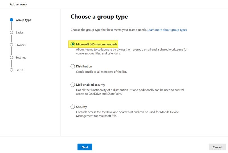 3 - Choisissez le type "Microsoft 365" et suivez l'assistant jusqu'au bout pour créer le groupe