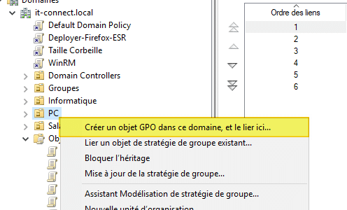 Effectuez un clic droit sur l'OU "PC" et cliquez sur "Créer un objet GPO dans ce domaine, et le lier ici...".