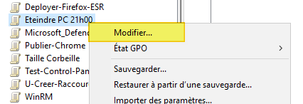 Dès lors que la GPO est créée, il faut la modifier : clic droit sur "Eteindre PC 21h00" puis "Modifier".