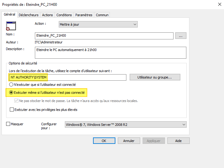 - Cochez l'option "Exécuter même si l'utilisateur n'est pas connecté" : si la machine est allumée, mais qu'il n'y a pas de session ouverte, elle s'éteindra quand même