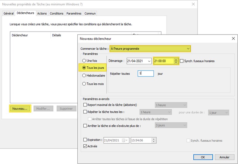 Basculez dans l'onglet "Déclencheurs", ce qui va permettre de définir l'heure à laquelle la machine doit s'éteindre. Cliquez sur "Nouveau", puis indiquez :