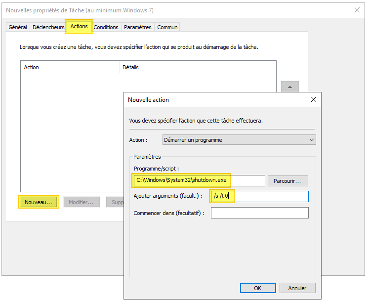 - Programme/script : C:\Windows\System32\shutdown.exe