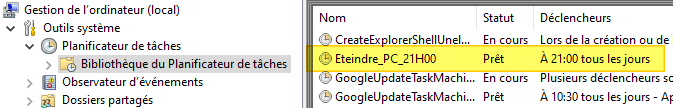 Ensuite sous "Outils système", "Planificateur de tâches", et enfin "Bibliothèque du Planificateur de tâches", on retrouve bien notre tâche "Eteindre_PC_21H00" :