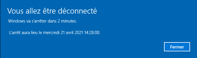 Si l'on veut, on peut remplacer "0" par une autre valeur, par exemple "120" pour 120 secondes. Ainsi, au moment où la tâche va s'exécuter, un message va s'afficher à l'écran (comme ci-dessous) : de quoi avertir un éventuel utilisateur connecté et lui permettre de fermer rapidement les programmes ouverts. Au bout de 120 secondes, l'ordinateur va s'éteindre.