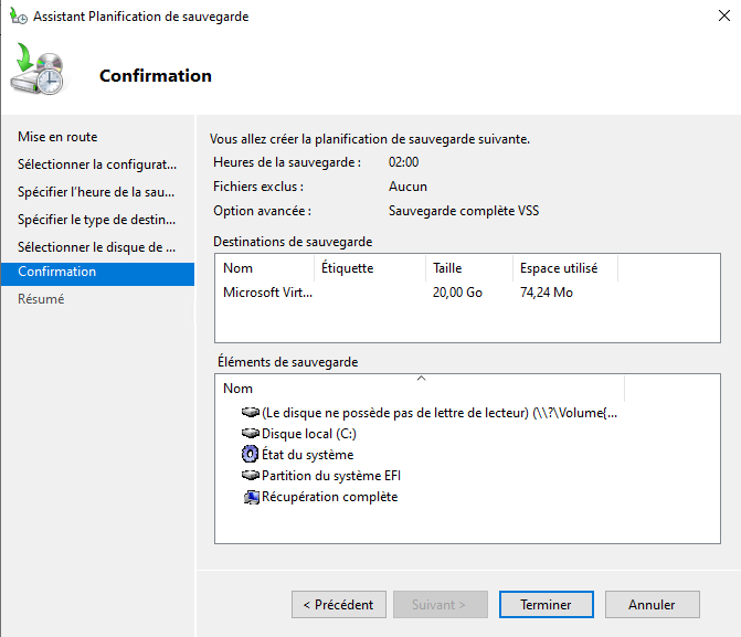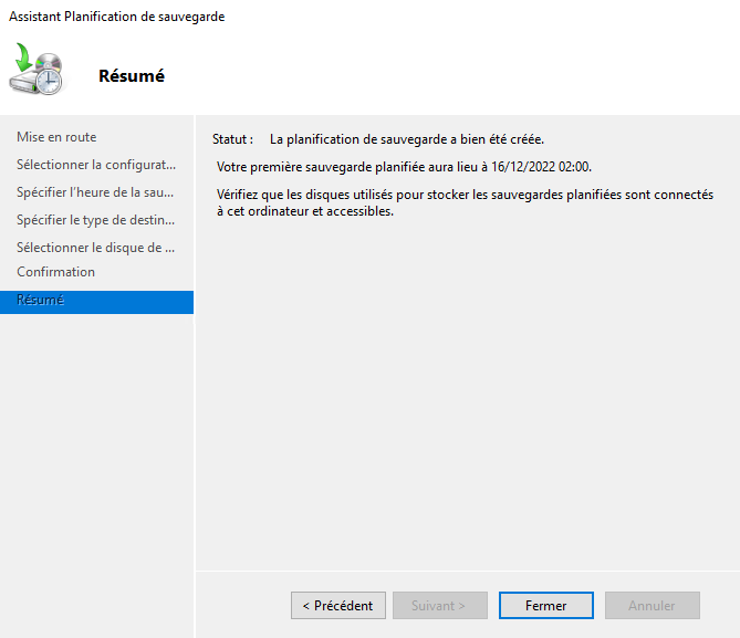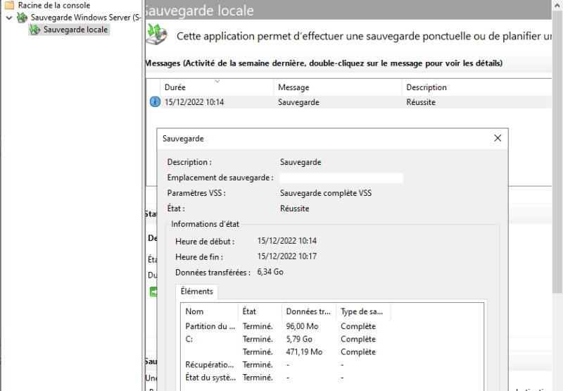 Lorsque la sauvegarde sera effectuée, selon le planning établit, le statut sera visible à partir de la console de Windows Server Backup.