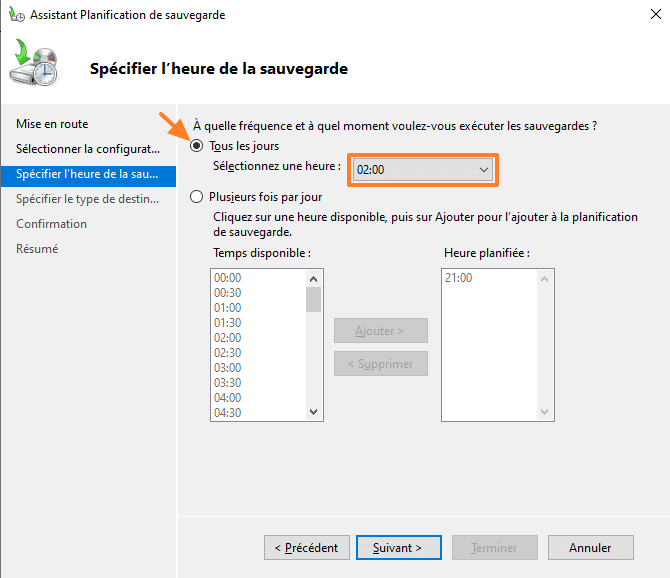 Ensuite, l'heure et la fréquence de la sauvegarde doivent être définit. Dans cet exemple, on sélectionne "Tous les jours" à 02:00.